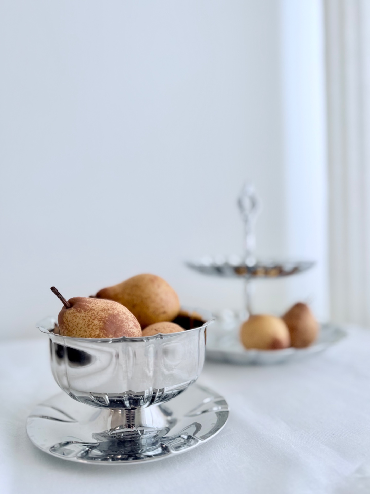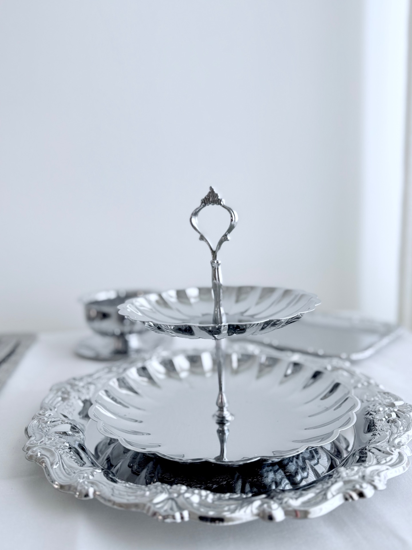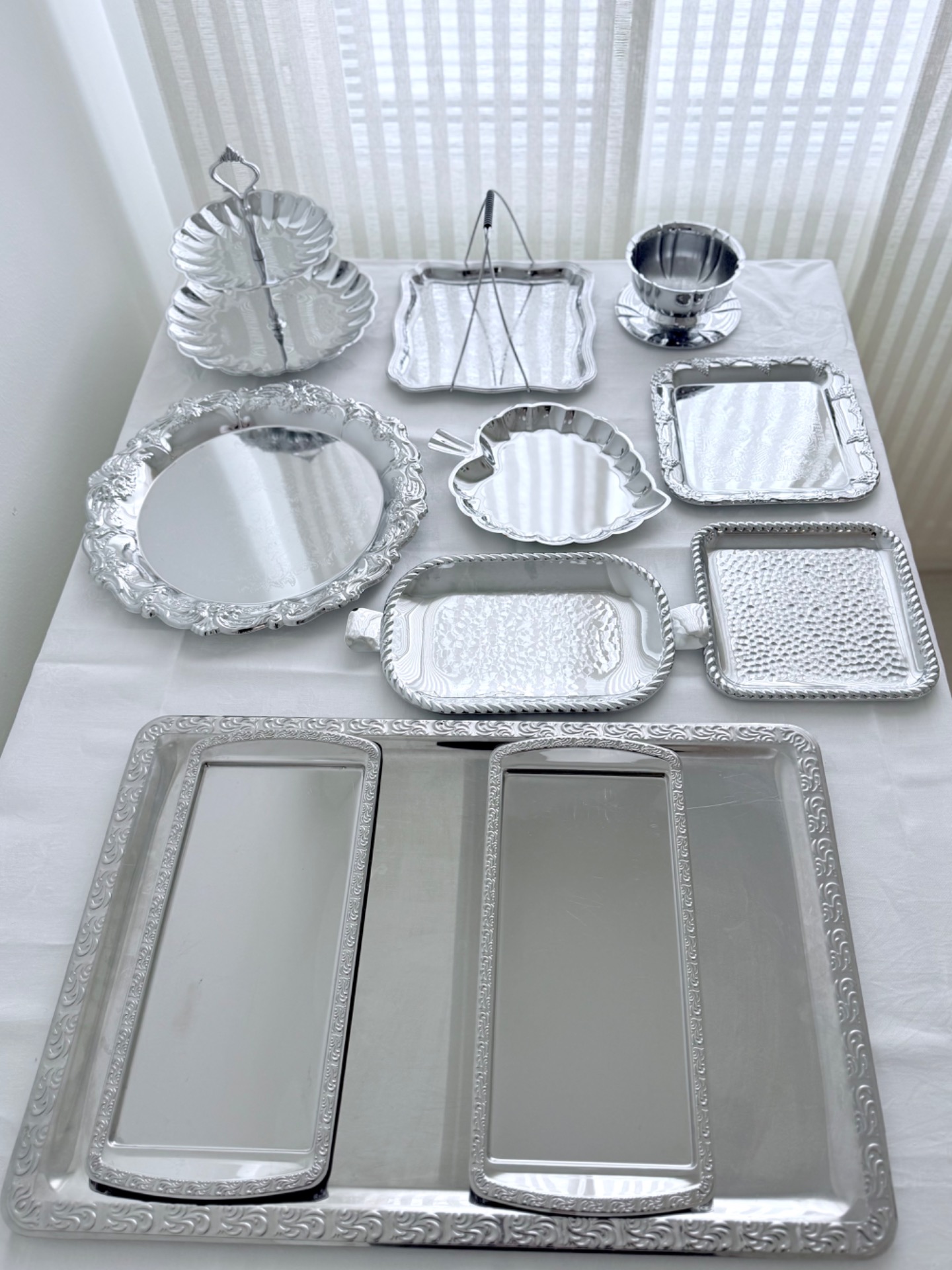 11 osainen tarjoiluastia- setti kiiltävää metallia.